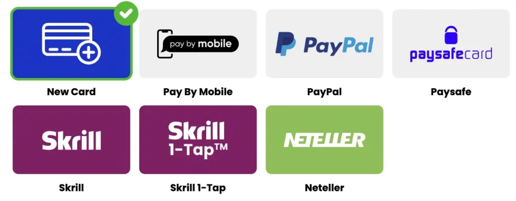 | Payment Methods | Debit: Visa, MasterCard E-wallets: Interac, MuchBetter, Jeton, MiFinity Prepaid vouchers: NeoSurf Crypto: Bitcoin, Litecoin, Dogecoin, Cardano, Tron, USDT |
