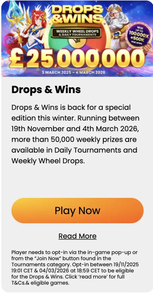 | Other Bonuses | No-deposit bonuses (on verification, birthdays, holidays); Weekly reload 50 FS (min £30, 40× wagering); Reload bonus 50% up to £1,050 + 50 FS (35× cash / 40× FS); Weekly cashback up to 15% (max £4,500 depending on VIP level); Live cashback 25% up to £300 (min £10) |