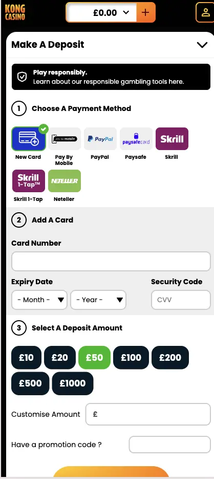 With your account created, the next important step is to fund your account. Thankfully, the Kong app supports transactions with e-wallets, credit and debit cards, prepaid vouchers and cryptocurrency. Our most popular payment options are MasterCard, Interac, MuchBetter, Jeton, MiFinity, NeoSurf, Cash2Code, Bitcoin, Litecoin and Dogecoin.