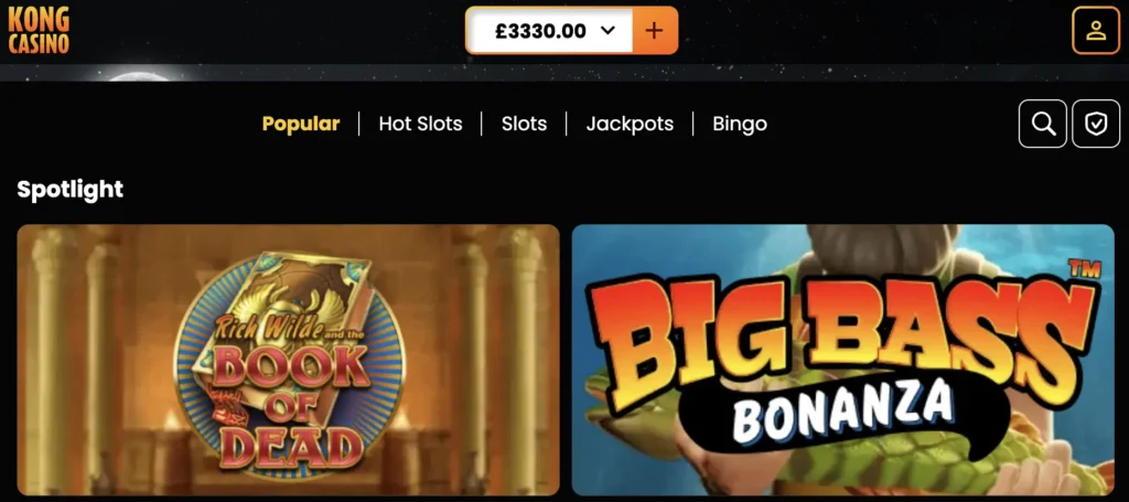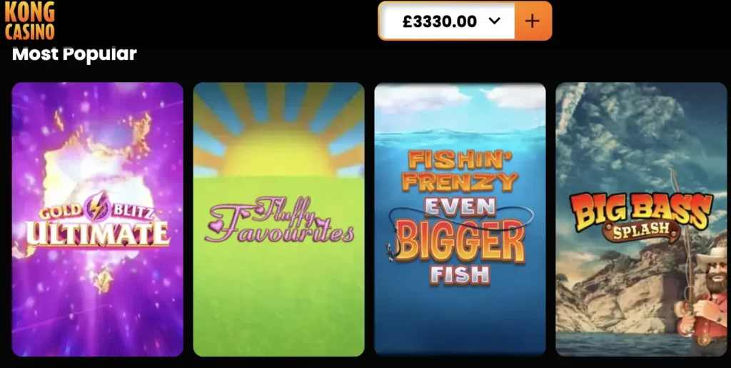 You can play classic and video slots at Kong. The Casino Kong games available include 3×3 reel classic machines, megaways, bonus buys, avalanche and cascades, Hold and Win variants, cluster pays and progressive jackpots.
